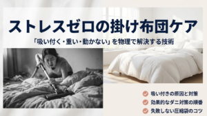 圧縮する前に、布団のホコリやダニも吸い取っておきたいですよね。でも、掛け布団に掃除機をかけると「布を吸い込んで動かない!」なんてことになりがち。そんなイライラを解消する「吸い付き防止」のテクニックもまとめています。