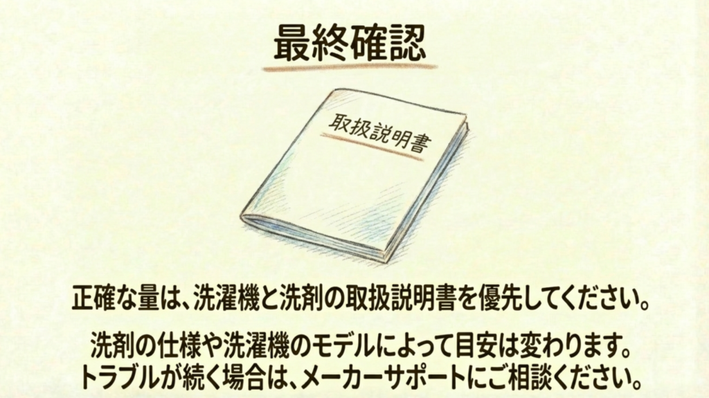 洗剤の使用量や洗濯機の表示仕様は、製品の改良や洗剤のリニューアルで変わることがあります。正確な情報は公式サイトと取扱説明書をご確認ください。不安が強い場合やトラブルが続く場合は、最終的な判断はメーカーサポートなど専門家にご相談ください