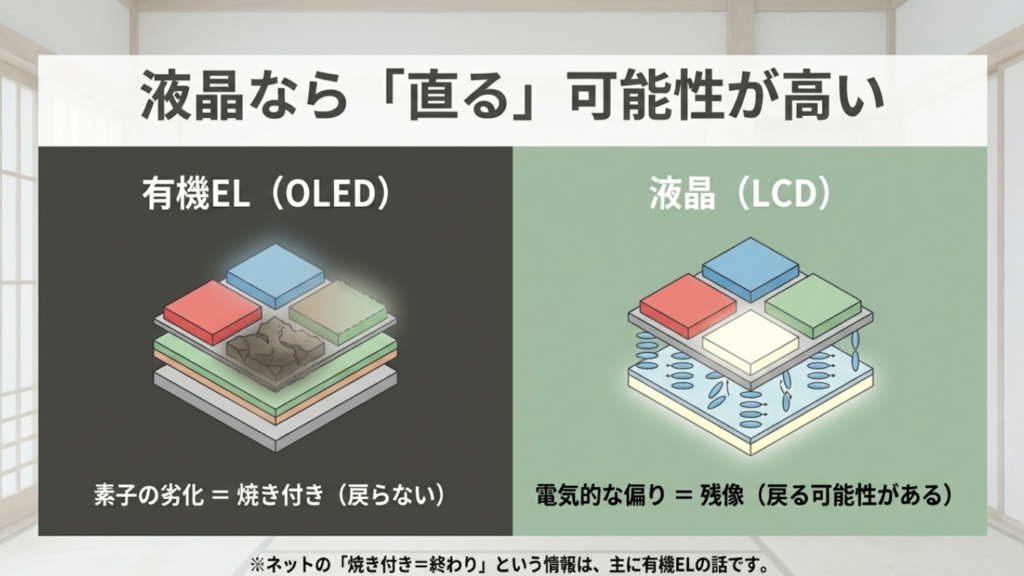 有機EL(OLED)で話題になる焼き付きは、発光する素子そのものが劣化して起きるので、基本的に元に戻りません。だからネット上の「焼き付き=終わり」情報をそのまま液晶に当てはめると、必要以上に不安が増えます。