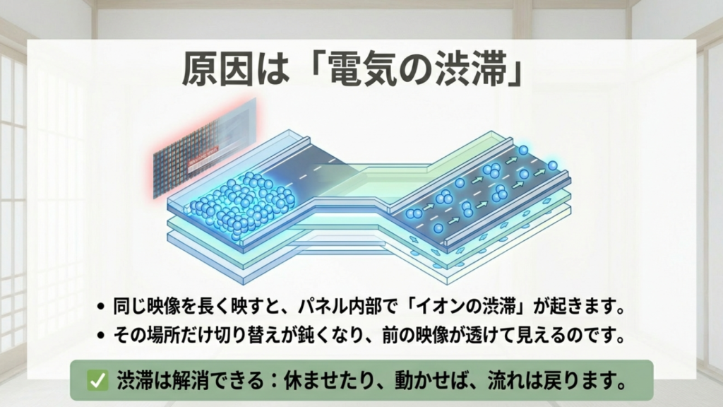 液晶の残像が出るときの背景は、ざっくり言うと「同じ画を長く出し続けた結果、パネル内部の状態が少し偏る」です。
