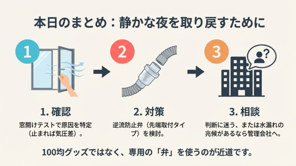 一瞬止めると音が消えて「これだ!」ってなるんですが、24時間換気が前提の住宅だと、止めっぱなしはおすすめしません。湿気や臭いがこもって、カビが出やすくなることもあります。だから私は、まず原因を確定させたうえで、恒久対策(後述の逆流防止弁)へ寄せるのがラクだと思っています。