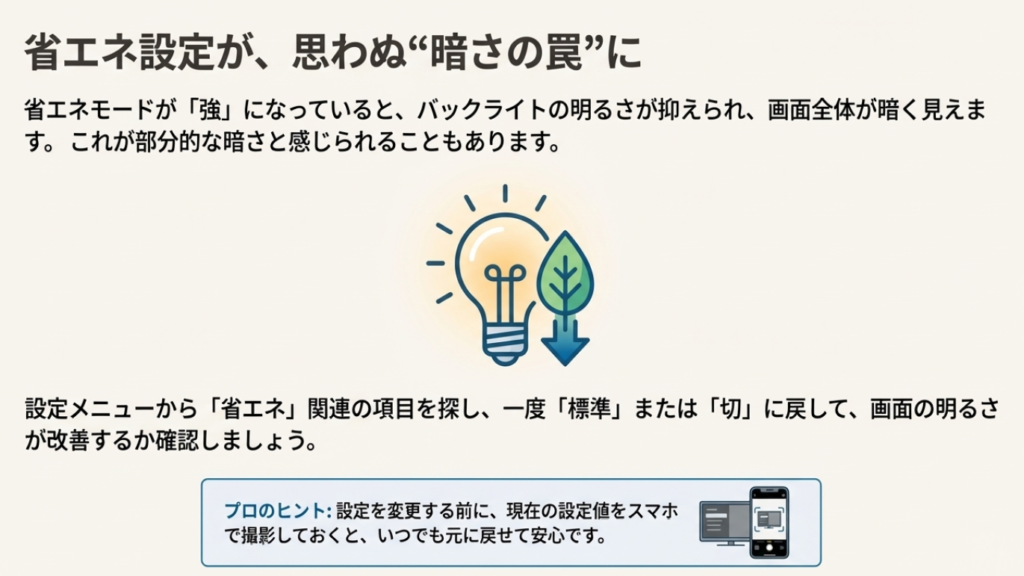 切り分けのコツは、いったん省エネをOFFまたは標準にして、暗さが改善するかを見ること。改善するなら、故障ではなく設定要因の可能性が高いです。