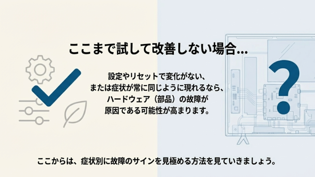 これで復帰するなら、ハード故障ではなく一時的な制御エラーだった可能性があります。逆に、毎回同じ症状が出るなら、次の章の「故障寄り」の切り分けに進みましょう。リセットで直らないのに暗さが固定なら、もう“ソフトの気まぐれ”ではない可能性が高いです。