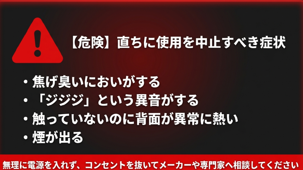 注意:焦げ臭い、ジジジ音、異常な発熱がある場合は、無理に何度も電源を入れないでください。安全のため、コンセントを抜いてメーカーや専門家へ相談が安心です。